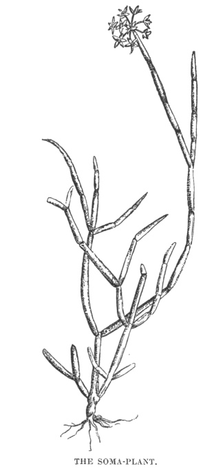 69:* The Soma-plant of the Rig-Veda is the Asclepias acida of Roxburgh. It is a creeping plant, almost destitute of leaves. It has small white fragrant flowers collected round the extremities of the branches. Roxburgh says that it yields purer milky juice than any other plant he knows; and that this juice is mild, and of an acid nature. The tender shoots are often plucked by native travellers. It grows on hills of the Punjab, in the Bolan Pass, in the neighbourhood of Poona, etc. In the Brāhmana of the Rig-Veda (Haug's Translation), is a most interesting account of the Soma sacrifice. This is occasionally made in the present day, but very few priests are acquainted with the ritual of this once celebrated sacrifice.
