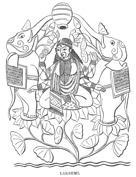As noticed in this last extract, Lakshmi, or Sri, is regarded as the goddess of Love, Beauty, and Prosperity. When a man is growing rich, it is said that Lakshmi has come to dwell with him; whilst those in adversity are spoken of as "forsaken of Lakshmi." In pictures she is painted as a lady of a bright golden colour, seated on a lotus, with two arms.