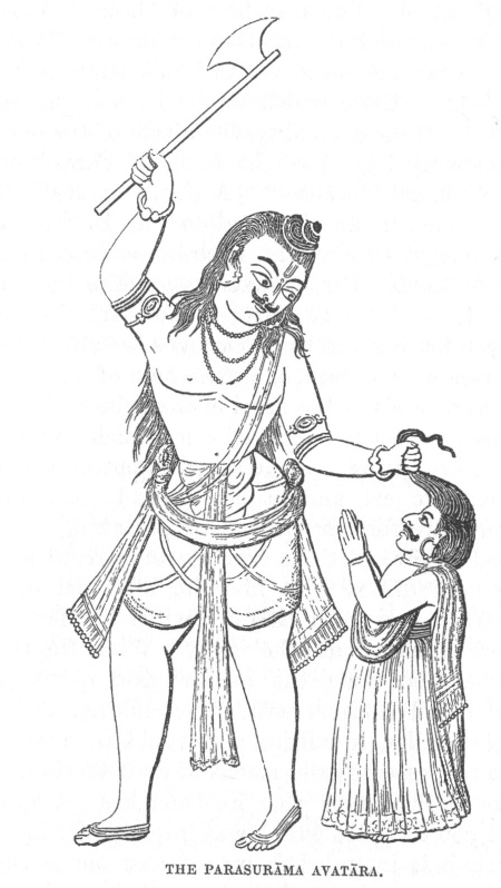 "Upon this, her sons came from the wood, and each as he entered was successively commended by his father to put his mother to death; but, amazed and influenced by natural affection, neither of them made any reply; therefore Jamadagni cursed them, and they became idiots. Lastly Rāma returned to the hermitage, when the mighty and holy Jamadagni said to him, 'Kill thy mother, who has sinned; and do it without repining.' Rāma accordingly took up his axe [this was the Parasu, or axe, which Siva had given him] and struck off his mother's head; whereupon the wrath of Jamadagni was assuaged, and, pleased with his son, said: 'Since thou hast obeyed my commands, and done what was hard to be performed, demand from me whatever blessing thou wilt, and thy desires shall be fulfilled.' Rāma begged these boons: the restoration of his mother to life, with forgetfulness of having been slain, and purification from all defilement; the return of his brothers to their natural condition; and for himself, invincibility in single combat, and length of days. All these his father bestowed.