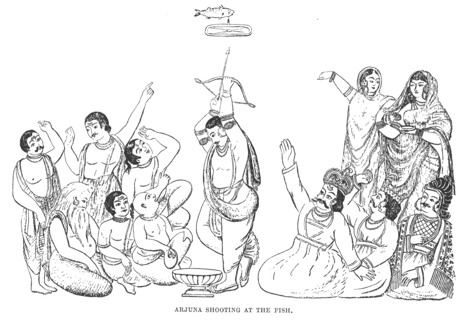After this occurrence, Vyāsa appeared to his grandsons, and informed them that Draupadi, the daughter of Drupada, King of Panchāla, was destined to be their common wife. This girl, in a former birth, was the daughter of a sage, and had performed a most severe penance in order that she might have a husband. Siva, pleased with her devotion, said, "You shall have five husbands; for five times you said, 'Give me a husband.'" When the brothers returned from Draupadi's Svayambara (a tournament in which the princess chose for herself a husband), Arjuna having been selected from amongst many suitors on account of his skill in archery, their mother, hearing their footsteps, and, fancying they were bringing alms, said, "Divide it amongst yourselves." The word of a mother could not be set aside, so Vyāsa showed them that it was appointed that Draupadi should be the wife of each. At this tournament Arjuna displayed great skill in the use of the bow, by piercing a fish that was suspended in the air, without looking directly at the object; he saw its image only, reflected in a pan of water on the ground.