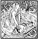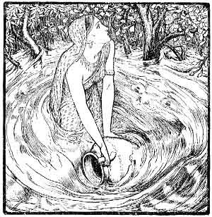 At noon, when she went to bring water, it suddenly dried up before her, and she began to weep. Then after a while the water began slowly to rise. When it reached her ankles she tried to fill her pitcher, but it would not go under the water. Being frightened, she began to wail and cry to her brother: