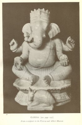Gane´sa 1, the four-armed, elephant-headed god of wisdom, is the son of Shiva and Parvati. He is the general of Shiva's army, the patron of learning and the giver of good fortune. At the beginning of books he is invoked by poets, his image is placed on the ground when a new house is built, and he is honoured before a journey is begun or any business is undertaken. The elephant's head is an emblem of sagacity. A myth in one of the Puranas relates that the planet Saturn, being under a curse, decapitated Ganesa simply by looking at him. Vishnu mounted on the back of the man-eagle Garuda and came to the child's aid. He cut off the head of Indra's elephant and placed it on Ganesa's neck. In a conflict with a Deva-rishi Ganesa lost one of his tusks. Several myths have gathered round this popular, elephant-headed deity, who is also identified with the wise rat.