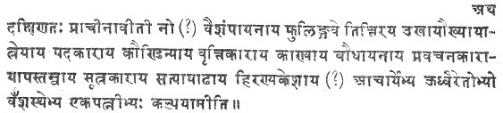 [paragraph continues] Satyâshâdha Hiranyakesin. The same order is observed in the distribution of the offerings at the Sarpabali, described in the Grihya-sûtra 1, where the following teachers of the Yagur-veda are specially named, viz. Vaisampâyana, Phuliṅgu, Tittiri, Ukha, Aukhya, Âtreya the author of the Pada-text, Kaundinya the author of the commentary, Kânva Baudhâyana the author of the Pravakana, Âpastamba the author of the Sûtra, and Satyâshâdha Hiranyakesin. Neither of these two passages belongs to Baudhâyana. They are both clearly interpolations. But they show that Mahâdeva's statement, which makes Baudhâyana the first expounder of the Kalpa among the Taittirîyavedins, agrees with the tradition of the Baudhâyanîyas themselves. For not only the place allotted to Baudhâyana's name, but still more the title Pravakanakâra which he receives, show that the followers of his school placed him before and above all other teachers of the ritual. The term pravakana, which literally means 'proclaiming or recitation,' has frequently the technical sense of 'oral instruction,' and is applied both to the traditional lore contained in the Brâhmanas, and to the more systematic teaching of the Aṅgas 2. If, therefore, a teacher is called the author of the Pravakana of a Sâkhâ, that can only mean that he is something more than a common Sûtrakâra, and is considered to be the originator of the whole 'system of instruction among its followers. The epithet Kânva, which Baudhâyana receives in both the passages quoted above, indicates that he belonged to the Vedic Gotra of the Kanvas. It deserves to be noted that Govindasvâmin, too, on I, 3, 5, 13, explains the name Baudhâyana by Kânvâyana 3.