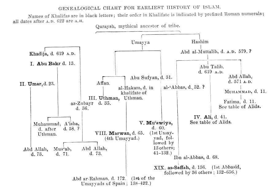 so soon to transfer themselves from the little circle of Mecca and al-Madina and to fight themselves out on the broad field of Muslim history. For, in truth, in the development of no other state have little causes produced such great effects as here. For example, it may be said, broadly and yet truly, that the seclusion of Muslim women, with all its disastrous effects at the present day for a population of two hundred millions, runs back to the fact that A’isha, the fourteen-year-old wife of Muhammad, once lost a necklace under what the gossips of the time thought were suspicious circumstances. As to the point now in hand, it is quite certain that Muslim history for several hundred years was conditioned and motived by the quarrels of Meccan families. The accompanying genealogy will give the necessary starting-point. The mythical ancestor is Quraysh; hence "the Quraysh," or "Quraysh" as a name for the tribe. Within the tribe, the two most important families are those of Hashim and Umayya; their rivalries for the succession of the Prophet fill the first century and a half of Muslim history, and the immediately pre-Islamic history of Mecca is similarly filled with a contest between them as to the guardianship of the Ka‘ba and the care of the pilgrims to that sanctuary. Whether this earlier history is real, or a reflection from the later Muslim times, we need not here consider. The next important division is that between the families of al-Abbas and Abu Talib, the uncles of the Prophet. From the one were descended the Abbasids, as whose heir-at-law the Sultan of the Ottoman Empire now claims the Khalifate, and from