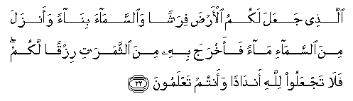 22. Allathee jaAAala lakumu al-arda firashan waalssamaa binaan waanzala mina alssama-i maan faakhraja bihi mina alththamarati rizqan lakum fala tajAAaloo lillahi andadan waantum taAAlamoona