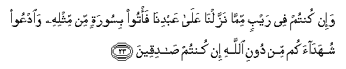 23. Wa-in kuntum fee raybin mimma nazzalna AAala AAabdina fa/too bisooratin min mithlihi waodAAoo shuhadaakum min dooni Allahi in kuntum sadiqeena