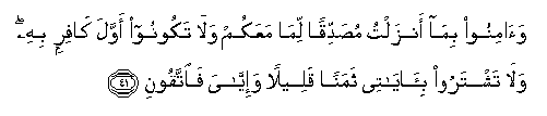 41. Waaminoo bima anzaltu musaddiqan lima maAAakum wala takoonoo awwala kafirin bihi wala tashtaroo bi-ayatee thamanan qaleelan wa-iyyaya faittaqooni