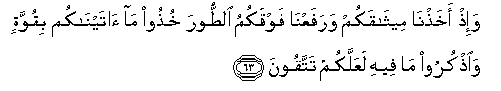 63. Wa-ith akhathna meethaqakum warafaAAna fawqakumu alttoora khuthoo ma ataynakum biquwwatin waothkuroo ma feehi laAAallakum tattaqoona