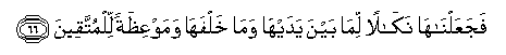 66. FajaAAalnaha nakalan lima bayna yadayha wama khalfaha wamawAAithatan lilmuttaqeena