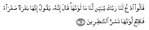 69. Qaloo odAAu lana rabbaka yubayyin lana ma lawnuha qala innahu yaqoolu innaha baqaratun safrao faqiAAun lawnuha tasurru alnnathireena