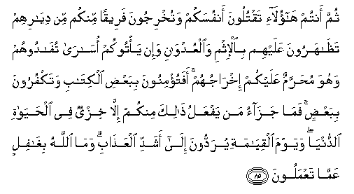 85. Thumma antum haola-i taqtuloona anfusakum watukhrijoona fareeqan minkum min diyarihim tathaharoona AAalayhim bial-ithmi waalAAudwani wa-in ya/tookum osara tufadoohum wahuwa muharramun AAalaykum ikhrajuhum afatu/minoona bibaAAdi alkitabi watakfuroona bibaAAdin fama jazao man yafAAalu thalika minkum illa khizyun fee alhayati alddunya wayawma alqiyamati yuraddoona ila ashaddi alAAathabi wama Allahu bighafilin AAamma taAAmaloona