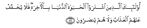 86. Ola-ika allatheena ishtarawoo alhayata alddunya bial-akhirati fala yukhaffafu AAanhumu alAAathabu wala hum yunsaroona
