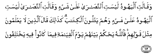 113. Waqalati alyahoodu laysati alnnasara AAala shay-in waqalati alnnasara laysati alyahoodu AAala shay-in wahum yatloona alkitaba kathalika qala allatheena la yaAAlamoona mithla qawlihim faAllahu yahkumu baynahum yawma alqiyamati feema kanoo feehi yakhtalifoona