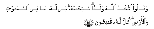 116. Waqaloo itakhatha Allahu waladan subhanahu bal lahu ma fee alssamawati waal-ardi kullun lahu qanitoona