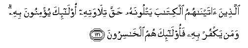 121. Allatheena ataynahumu alkitaba yatloonahu haqqa tilawatihi ola-ika yu/minoona bihi waman yakfur bihi faola-ika humu alkhasiroona