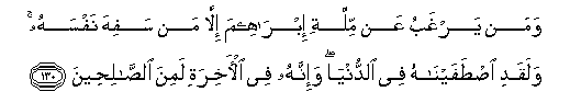 130. Waman yarghabu AAan millati ibraheema illa man safiha nafsahu walaqadi istafaynahu fee alddunya wa-innahu fee al-akhirati lamina alssaliheena