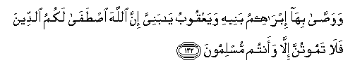 132. Wawassa biha ibraheemu baneehi wayaAAqoobu ya baniyya inna Allaha istafa lakumu alddeena fala tamootunna illa waantum muslimoona