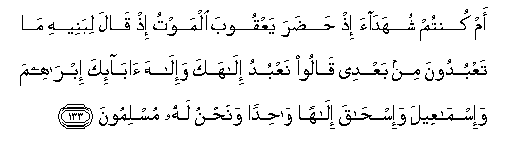 133. Am kuntum shuhadaa ith hadara yaAAqooba almawtu ith qala libaneehi ma taAAbudoona min baAAdee qaloo naAAbudu ilahaka wa-ilaha aba-ika ibraheema wa-ismaAAeela wa-ishaqa ilahan wahidan wanahnu lahu muslimoona