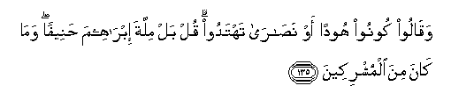 135. Waqaloo koonoo hoodan aw nasara tahtadoo qul bal millata ibraheema haneefan wama kana mina almushrikeena