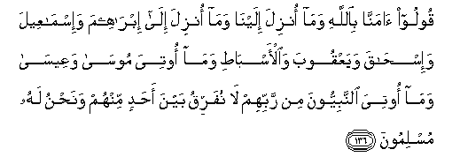 136. Qooloo amanna biAllahi wama onzila ilayna wama onzila ila ibraheema wa-ismaAAeela wa-ishaqa wayaAAqooba waal-asbati wama ootiya moosa waAAeesa wama ootiya alnnabiyyoona min rabbihim la nufarriqu bayna ahadin minhum wanahnu lahu muslimoona