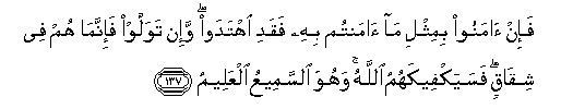 137. Fa-in amanoo bimithli ma amantum bihi faqadi ihtadaw wa-in tawallaw fa-innama hum fee shiqaqin fasayakfeekahumu Allahu wahuwa alssameeAAu alAAaleemu