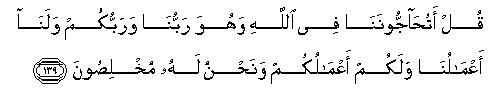 139. Qul atuhajjoonana fee Allahi wahuwa rabbuna warabbukum walana aAAmaluna walakum aAAmalukum wanahnu lahu mukhlisoona