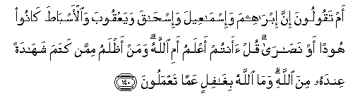140. Am taqooloona inna ibraheema wa-ismaAAeela wa-ishaqa wayaAAqooba waal-asbata kanoo hoodan aw nasara qul aantum aAAlamu ami Allahu waman athlamu mimman katama shahadatan AAindahu mina Allahi wama Allahu bighafilin AAamma taAAmaloona