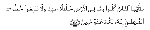 168. Ya ayyuha alnnasu kuloo mimma fee al-ardi halalan tayyiban wala tattabiAAoo khutuwati alshshaytani innahu lakum AAaduwwun mubeenun