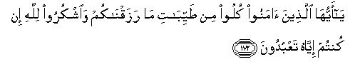 172. Ya ayyuha allatheena amanoo kuloo min tayyibati ma razaqnakum waoshkuroo lillahi in kuntum iyyahu taAAbudoona
