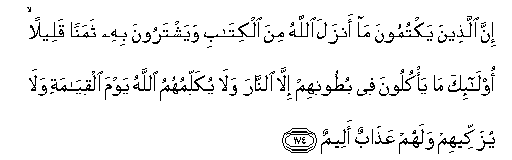 174. Inna allatheena yaktumoona ma anzala Allahu mina alkitabi wayashtaroona bihi thamanan qaleelan ola-ika ma ya/kuloona fee butoonihim illa alnnara wala yukallimuhumu Allahu yawma alqiyamati wala yuzakkeehim walahum AAathabun aleemun