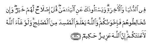 220. Fee alddunya waal-akhirati wayas-aloonaka AAani alyatama qul islahun lahum khayrun wa-in tukhalitoohum fa-ikhwanukum waAllahu yaAAlamu almufsida mina almuslihi walaw shaa Allahu laaAAnatakum inna Allaha AAazeezun hakeemun