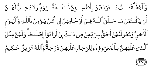 228. Waalmutallaqatu yatarabbasna bi-anfusihinna thalathata quroo-in wala yahillu lahunna an yaktumna ma khalaqa Allahu fee arhamihinna in kunna yu/minna biAllahi waalyawmi al-akhiri wabuAAoolatuhunna ahaqqu biraddihinna fee thalika in aradoo islahan walahunna mithlu allathee AAalayhinna bialmaAAroofi walilrrijali AAalayhinna darajatun waAllahu AAazeezun hakeemun