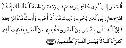 258. Alam tara ila allathee hajja ibraheema fee rabbihi an atahu Allahu almulka ith qala ibraheemu rabbiya allathee yuhyee wayumeetu qala ana ohyee waomeetu qala ibraheemu fa-inna Allaha ya/tee bialshshamsi mina almashriqi fa/ti biha mina almaghribi fabuhita allathee kafara waAllahu la yahdee alqawma alththalimeena