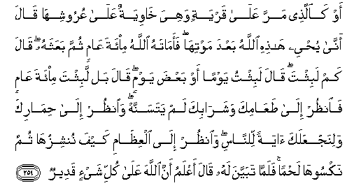 259. Aw kaallathee marra AAala qaryatin wahiya khawiyatun AAala AAurooshiha qala anna yuhyee hathihi Allahu baAAda mawtiha faamatahu Allahu mi-ata AAamin thumma baAAathahu qala kam labithta qala labithtu yawman aw baAAda yawmin qala bal labithta mi-ata AAamin faonthur ila taAAamika washarabika lam yatasannah waonthur ila himarika walinajAAalaka ayatan lilnnasi waonthur ila alAAithami kayfa nunshizuha thumma naksooha lahman falamma tabayyana lahu qala aAAlamu anna Allaha AAala kulli shay-in qadeerun