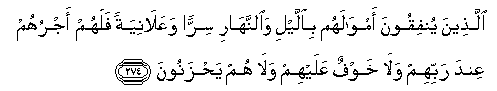 274. Allatheena yunfiqoona amwalahum biallayli waalnnahari sirran waAAalaniyatan falahum ajruhum AAinda rabbihim wala khawfun AAalayhim wala hum yahzanoona