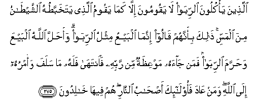 275. Allatheena ya/kuloona alrriba la yaqoomoona illa kama yaqoomu allathee yatakhabbatuhu alshshaytanu mina almassi thalika bi-annahum qaloo innama albayAAu mithlu alrriba waahalla Allahu albayAAa waharrama alrriba faman jaahu mawAAithatun min rabbihi faintaha falahu ma salafa waamruhu ila Allahi waman AAada faola-ika as-habu alnnari hum feeha khalidoona