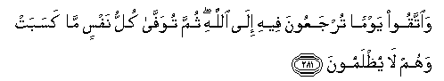 281. Waittaqoo yawman turjaAAoona feehi ila Allahi thumma tuwaffa kullu nafsin ma kasabat wahum la yuthlamoona
