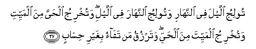 27. Tooliju allayla fee alnnahari watooliju alnnahara fee allayli watukhriju alhayya mina almayyiti watukhriju almayyita mina alhayyi watarzuqu man tashao bighayri hisabin