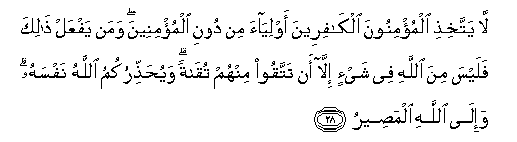 28. La yattakhithi almu/minoona alkafireena awliyaa min dooni almu/mineena waman yafAAal thalika falaysa mina Allahi fee shay-in illa an tattaqoo minhum tuqatan wayuhaththirukumu Allahu nafsahu wa-ila Allahi almaseeru