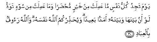 30. Yawma tajidu kullu nafsin ma AAamilat min khayrin muhdaran wama AAamilat min soo-in tawaddu law anna baynaha wabaynahu amadan baAAeedan wayuhaththirukumu Allahu nafsahu waAllahu raoofun bialAAibadi