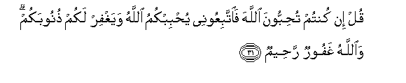 31. Qul in kuntum tuhibboona Allaha faittabiAAoonee yuhbibkumu Allahu wayaghfir lakum thunoobakum waAllahu ghafoorun raheemun