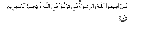 32. Qul ateeAAoo Allaha waalrrasoola fa-in tawallaw fa-inna Allaha la yuhibbu alkafireena