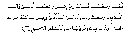 36. Falamma wadaAAat-ha qalat rabbi innee wadaAAtuha ontha waAllahu aAAlamu bima wadaAAat walaysa alththakaru kaalontha wa-innee sammaytuha maryama wa-innee oAAeethuha bika wathurriyyataha mina alshshaytani alrrajeemi