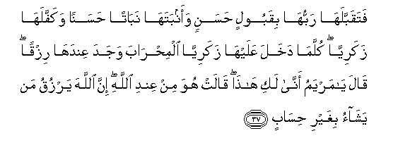 37. Fataqabbalaha rabbuha biqaboolin hasanin waanbataha nabatan hasanan wakaffalaha zakariyya kullama dakhala AAalayha zakariyya almihraba wajada AAindaha rizqan qala ya maryamu anna laki hatha qalat huwa min AAindi Allahi inna Allaha yarzuqu man yashao bighayri hisabin