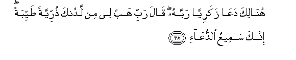 38. Hunalika daAAa zakariyya rabbahu qala rabbi hab lee min ladunka thurriyyatan tayyibatan innaka sameeAAu aldduAAa/-i