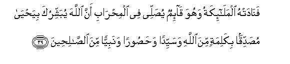 39. Fanadat-hu almala-ikatu wahuwa qa-imun yusallee fee almihrabi anna Allaha yubashshiruka biyahya musaddiqan bikalimatin mina Allahi wasayyidan wahasooran wanabiyyan mina alssaliheena