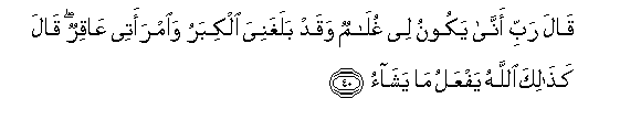 40. Qala rabbi anna yakoonu lee ghulamun waqad balaghaniya alkibaru waimraatee AAaqirun qala kathalika Allahu yafAAalu ma yasha/o