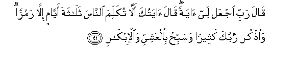 41. Qala rabbi ijAAal lee ayatan qala ayatuka alla tukallima alnnasa thalathata ayyamin illa ramzan waothkur rabbaka katheeran wasabbih bialAAashiyyi waal-ibkari