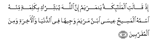 45. Ith qalati almala-ikatu ya maryamu inna Allaha yubashshiruki bikalimatin minhu ismuhu almaseehu AAeesa ibnu maryama wajeehan fee alddunya waal-akhirati wamina almuqarrabeena
