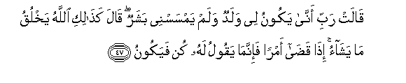 47. Qalat rabbi anna yakoonu lee waladun walam yamsasnee basharun qala kathaliki Allahu yakhluqu ma yashao itha qada amran fa-innama yaqoolu lahu kun fayakoonu